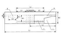 厚度h为1mm的介质板1中沿其一边插入一块长度为45mm的金属隔板10,介质板1的长度为88.5mm,介质板1的宽度为15mm,金属隔板10的宽度为10mm。介质板1内部和表层覆有由各矩形金属贴片构成的整体金属贴片(参见图2)。X轴上方的金属贴片由第一至第六金属贴片2、3、4、5、6、7及第一、二锥形金属贴片8、9和两条金属导带组成,各长方形金属贴片用z方向上等高为0.1mm、宽度为10mm的金属横条相连成一整体,各长方形金属贴片的宽度均为10mm,第一金属贴片2的长度为17mm,第二至第五金属贴片3、4、5、6的长度均为3.5mm,第六金属贴片7的长度为17.5mm,第一、二锥形贴片8、9的尺寸相同,两条平行边分别为1.5mm和4.7mm,长度为13.9mm。介质板1的另一面的金属贴片整体由第七至第十二金属贴片11、12、13、14、15、16和第三锥形金属贴片17,其中第九至第十二长方形金属贴片13、14、15、16的尺寸与第二至第五金属贴片3、4、5、6相同,第八金属贴片12的尺寸与第六金属贴片7相同,第三锥形贴片17的尺寸与第一、二锥形贴片8、9相同,第七金属贴片11的长度为37mm,宽度为10mm。位于介质板1两侧的金属贴片整体通过一行金属化通孔相连,金属孔到矩形贴片的远边距离为7.2mm,在介质平面上沿x轴方向直线分布。金属孔直径d为2mm,孔间距S为3.5mm。A