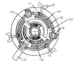 转盘12整体呈去顶圆锥体状,并形成有中心孔120,以便套装于基座主体立柱112上。转盘12包括彼此相对地形成于转盘底面上的一对定位块121,从而当将转盘12安装于基座主体11中时,定位块121座落于基座主体定位槽114中。各定位块121和基座主体定位槽114中相对应的止动凸块1141之间设置有弹簧122,其趋于将定位块121分别抵靠于另一止动凸块上(参见图7)。转盘12下表面外侧形成有环状凹面123。该凹面123上形成有三段彼此间隔的齿条124(参见图8),以分别与第二齿轮18选择性地啮合。在转盘12锥形侧面上绕转盘圆周形成有多个齿125(参见图9),以与第一齿轮17相啮合。转盘12的上表面绕中心孔120形成有沉孔126,以接纳致动组件13。在沉孔126内绕中心孔120形成有半圆形导向槽127。为了便于排出转盘12内的水或杂质,可在导向槽127内形成多个贯穿转盘12的导流孔1271。The