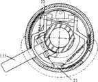 致动组件13包括:接纳于转盘沉孔126中的底板130;底板130中央形成有中心孔131,以套装于基座主体立柱112上;从底板130底面向下延伸的导向块132,其在将致动组件13安装于转盘12中时座落于转盘导向槽127中。转盘导向槽127中设置一对弹簧133,各弹簧两端分别抵靠在半圆形导向槽127的一端和导向块132上,以趋于使致动组件13处于中间平衡位置(参见图10)。致动组件13还包括从底板130的顶面向上延伸的支柱134,以及枢转地结合于支柱134顶端的手柄135,其中支柱134的高度确定为使其顶端处于基座内盖14上侧,而手柄135的末端延伸至基座外盖15外。The actuating