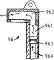 为了防止拉力弹簧95突然将支撑架91拉回第四管件8内而对使用者造成伤害,可在支撑架91和第四管件8之间设置空气阻尼单元96。如图46和47所示,该空气阻尼单元包括:竖直设置的第一气缸961;横向固定于在第一气缸末端并与第一气缸连通的第二气缸962;可移动地设置于第一气缸内的活塞963以及连接于活塞的活塞杆964。该第二气缸侧壁中形成有进气孔9621;膜片9622设置于气缸内壁对应于进气孔9621的位置上,以覆盖该进气孔。该膜片9622在远离第一气缸的一边固定,而其他边缘自由。另外,在第二气缸的气缸壁中还形成有出气孔9623,该出气孔9623的尺寸远小于进气孔9621的尺寸。从而,当活塞963受活塞杆964牵引而远离第二气缸时,空气主要经由进气孔9621进入第一、第二气缸内,从而活塞963可以快速滑动。然而,当活塞963由活塞杆964推动而靠近第二气缸时,第一、第二气缸内的空气需要排出,然而需排出的空气将膜片9622压靠在进气孔9621上,使得空气无法经过进气孔9621排出,而只能经由尺寸很小的出气孔9623排出。这样,活塞963在靠近第二气缸的移动中将收到较大的空气阻力而只能缓慢的滑动。In order to prevent the