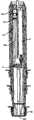 第二管件6包括可上下移动地套装于第一管件外壳51中的管状外壳61。一托架62固定于外壳61上端,并包括彼此间隔开的上、下托板。第一柱状传动轴281贯穿该托架62,并可相对该托架62自由旋转。受力齿轮63和作功齿轮64上下叠置地夹持于托架62的上下托板之间,且套装于第一柱状传动轴281上。受力齿轮63中心孔的横截面形成为矩形,且尺寸确定为稍大于第一柱状传动轴281横截面的尺寸,从而当将受力齿轮63套装于该第一柱状传动轴上时,其可沿该第一柱状传动轴的长度方向滑动,但是不可相对第一柱状传动轴旋转(参见图19和28)。然而,作功齿轮64中心孔的尺寸却确定为当其套装于第一柱状传动轴上时可相对于该第一柱状传动轴自由旋转(参见图20和28)。受力齿轮63和作功齿轮64之间通过弹簧65连接,该弹簧一端固定于受力齿轮63上,而另一端固定于作功齿轮64上。从而,当第一柱状传动轴281旋转而带动受力齿轮63旋转时,受力齿轮63借助弹簧65带动作功齿轮64一起旋转。The second pipe 6 includes a tubular shell 61 movably fitted in the