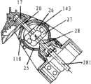 各第一齿轮17的输出轴20延伸至由各自的上、下保护罩形成保护腔内,且在其末端连接有第一棘爪26。与第一棘爪26啮合地设置有第二棘爪27,该第二棘爪27同样处于保护腔内,且其输出轴28延伸至支脚2内并枢转地连接于支脚2内的第一柱状传动轴281。第一棘爪26和第二棘爪27可以是六爪棘爪。当使支脚2相对于基座1转动时,支脚连接件23的连接片231就相对于基座的支架115转动,与此同时下保护罩25就在上保护罩内转动,直至下保护罩和/或联接突起抵靠在上保护罩的下缘处。在此过程中,第一和第二棘爪26、27始终保持啮合(参见图16和17)。The