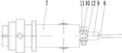 本实用新型的用于连接检测装置与检测点的接头的实施例1,如图1-7所示,由连接器基体及外接连接器构成。连接器基体由安装座1及装配于安装座1上的第一连接器2、第二连接器3及第三连接器4组成。安装座1呈两端开口的筒形,第一、第二连接器分别同轴固定装配于安装座1的两端,第三连接器4固定装配于安装座1的周向上且其轴线沿安装座1的径向延伸;第一、第二、第三连接器均通过各自的壳体与安装座1固定配合且它们的壳体与安装座1固定配合的一端均与安装座1的内腔相通,第一连接器2有三个接触件,第一连接器2的接触件为插孔接触件,此处设第一连接器2的接触件分别为a、b、c,第二连接器3同样有三个接触件,三个接触件均为插针接触件,此处设该三个接触件为A、B、C,第三连接器4为用于与对应的检测装置插接的输出连接器,第三连接器4具有六个接触件,六个接触件均为插针接触件,此处设该六个接触件为d、e、f、g、h、i,其中接触件a、A、d互相对应并通过安装座内的线缆5电性连接,接触件b、B、e互相对应并通过安装座内的线缆5电性连接,接触件c、C、f互相对应并通过安装座内的线缆5电性连接,从而可通过第一、第二、第三连接器中的一个来(不同时)检测另外两个上的信号,接触件g、h、i为扩展接触件且连接有扩展线缆6,扩展接触件及扩展线缆6用于实现对该三通连接器的扩展,当三个连接器不能满足检测时的需要时,可通过所述扩展线缆外接入新的外接连接器,从而实现第三连接器对外接电连接器上的信号的检测;本实施例中,通过外接线缆接入的外接连接器有两个,两外接连接器分别为主连接器和旁路连接器。主连接器包括圆筒形的主壳体7及通过绝缘体固定装配于主壳体7内的主接触件8,主接触件8有三个,三个主接触件8均为插孔接触件,此处设该三个主接触件分别设为o、p、q,三个主接触件的接线端分别通过扩展线缆6与接触件g、h、i对应电性连接,扩展线缆6从主壳体7的后端引入并于主壳体7的后端处被压线套9、压板10及螺栓11压紧,具体地说,主壳体7的尾端处设有两个向后延伸的耳片12,螺栓11有两个且分别穿设于两耳片12上,两螺栓11之间互相平行,压板10有两个且两压板10沿对应螺栓的轴向设于耳片的两侧,压线套9插设于主壳体尾端,扩展线缆6穿过压线套9后进入主壳体7,在经过压线套时其外皮被螺栓及压板压紧,从而实现了扩展线缆6与主连接器之间的抗拉功能;旁路连接器包括圆筒形的旁路壳体13及通过绝缘体设于旁路壳体13内的旁路接触件14,旁路壳体13的一端固定装配于主壳体7的周向上并与主壳体7连通,另一端沿主壳体7的径向向外悬伸,旁路接触件14有三个,三个旁路接触件均为插针接触件,此处将三个旁路接触件分别设为O、P、Q,则主接触件o与旁路接触件O、主接触件p与旁路接触件P、主接触件q与旁路接触件Q的接线端分别通过主壳体内的线缆对应电性连接。