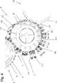 An jeder Platine8.1 ist zwischen den beiden Flaschengreifern8 ein Steuerarm22 mit einem Ende befestigt, und zwar derart, dass dieser Steuerarm mit seiner Längserstreckung radial zur jeweiligen von dem Gelenkbolzen17 gebildeten Schwenkachse der Platine8.1 orientiert ist. Jeder Steuerarm22 ist an seinem der zugehörigen Platine8.1 entfernt liegenden Ende mit einem Führungsstück23 ausgebildet, welches gabelartig eine ortsfeste, d. h. mit dem Rotor15 nicht umlaufende, in sich geschlossene und bei der dargestellten Ausführungsform von einem Rohrprofil gebildete Führungskurve übergreift und an dieser Steuerkurve24 verschiebbar geführt ist. Um einen sicheren Eingriff des jeweiligen Führungsstücks in die Führungskurve zu gewährleisten, ist bei der dargestellten Ausführungsform jeder Steuerarm22 teleskopartige mit axial wirkenden Federmitteln ausgebildet, die das zugehörige Führungsstück23 gegen die Führungskurve24 andrücken.On every board 8.1 is between the two bottle grippers 8th acontrol arm 22 fastened with one end, in such a way that this control arm with its longitudinal extent radially to the respective of thehinge pin 17 formed pivot axis of the board 8.1 is oriented. Everycontrol arm 22 is at his of the associated board 8.1 remote end with aleader 23 formed, which fork-like a stationary, ie with therotor 15 not encircling, self-contained and formed in the illustrated embodiment of a tubular profile guide curve and engages on thiscontrol cam 24 slidably guided. In order to ensure a secure engagement of the respective guide piece in the guide curve, in the illustrated embodiment, eachcontrol arm 22 formed telescopically with axially acting spring means, which is the associatedguide piece 23 against theguide curve 24 press down.