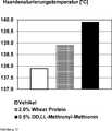 . Schutz des Haares vor thermischem Stress (Glätteisenbehandlung) durch präventive Schutzbehandlung mit Wirkstofflösung. Dargestellt ist die Verbesserung der durch differentielle Scanning-Kalorimetrie bestimmten Haardenaturierungstemperatur. , Protection of the hair against thermal stress (straightening iron treatment) by preventive protection treatment with active ingredient solution. Shown is the improvement in the hair denaturation temperature determined by differential scanning calorimetry.