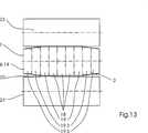 11 zeigt ein Beispiel, bei dem mit einem Array aus Mikroelektroden oder aus Mikrospulen die Dicke des Transfertuchs2 variiert wird. Das Array erstreckt sich über seine Länge parallel mit der Drehachse des Transferzylinders1. Falls gemäß einer Variante das Array17 ein Spulen-Array ist, ist das Funktionspolymer6 eine MAP-Schicht und ist die auf der Oberseite des Funktionspolymers6 angeordnete erste Schicht8 eine weichmagnetische Schicht und ist die zwischen der Trägerschicht4 und dem Funktionspolymer6 angeordnete zweite Schicht9 eine weichmagnetische Schicht oder eine permanentmagnetische Schicht. Falls gemäß einer zweiten Variante das Array17 ein Elektroden-Array ist, ist das Funktionspolymer6 eine EAP-Schicht und bildet die auf der Oberseite des Funktionspolymers6 angeordnete Schicht eine erste Elektrode5 und bildet die zwischen der Trägerschicht4 und dem Funktionspolymer6 angeordnete Schicht eine zweite Elektrode7. In den Transferzylinder1 integriert kann anstelle der Spule13 auch ein Array aus Spulen13 sein. Mit der in11 dargestellten Anordnung können aus einer homogenen Farbschicht heraus einzelne Druckpunkte erzeugt und übertragen werden. Hierbei wird die Dicke des Transfertuchs2 quer zur Druckrichtung der Druckmaschine, also parallel zur Rotationsrichtung des Transferzylinders1, variiert. Es erfolgt eine punktuelle Dickenänderung16 des Transfertuchs2. 11 shows an example in which with an array of microelectrodes or from micro-coils, the thickness of thetransfer blanket 2 is varied. The array extends along its length parallel to the axis of rotation of thetransfer cylinder 1 , If according to a variant, the array 17 a coil array is the functional polymer 6 a MAP layer and is the one on top of thefunctional polymer 6 arranged first layer 8th a soft magnetic layer and that between thecarrier layer 4 and thefunctional polymer 6 arranged second layer 9 a soft magnetic layer or a permanent magnetic layer. If according to a second variant, thearray 17 An electrode array is thefunctional polymer 6 an EAP layer and forms the top of thefunctional polymer 6 layer arranged afirst electrode 5 and forms the between thecarrier layer 4 and thefunctional polymer 6 layer arranged asecond electrode 7 , In thetransfer cylinder 1 can be integrated instead of thecoil 13 also an array ofcoils 13 be. With the in 11 illustrated arrangement can be generated and transmitted from a homogeneous ink layer out individual pressure points. This is the thickness of thetransfer fabric 2 transverse to the printing direction of the printing press, that is parallel to the direction of rotation of thetransfer cylinder 1 , varies. There is a punctual change inthickness 16 of thetransfer fabric 2 ,