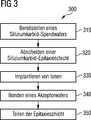 Optional oder zusätzlich können weitere Implantierungen auf der Siliziumkristallfläche der Epitaxieschicht realisiert werden, bevor der Akzeptorwafer auf die Epitaxieschicht gebondet wird, um eine bezeichnete Dotierstoffverteilung der späteren Rückseite einer auf dem Siliziumkarbidsubstrat hergestellten Siliziumkarbidvorrichtung zu erzeugen. Mit anderen Worten kann optional, zusätzlich oder alternativ eine bezeichnete Dotierstoffverteilung innerhalb der Epitaxieschicht entsprechend einer erforderlichen Dotierstoffverteilung an einer Siliziumkristallfläche der Epitaxieschicht für eine auf der Kohlenstoffkristallfläche der Epitaxieschicht des herzustellenden Siliziumkarbidsubstrats zu realisierende elektrische Siliziumkarbidvorrichtung implantiert werden. Auf diese Weise kann eine zusätzliche Implantierung während einer späteren Herstellung einer elektrischen Siliziumkarbidvorrichtung vermieden werden. Insbesondere ist es bei Siliziumkarbidvorrichtungen möglich, dass die bezeichnete Dotierstoffverteilung, die z.B. eine Emitterschicht oder/und eine Feldstoppschicht darstellen kann, sich während der nachfolgenden Hochtemperaturschritte aufgrund der kleinen Diffusionskoeffizienten von dotierenden Atomen in Siliziumkarbid nicht signifikant ändert. Optionally or additionally, further implants may be realized on the silicon crystal surface of the epitaxial layer before the acceptor wafer is bonded to the epitaxial layer to produce a designated dopant distribution of the later back side of a silicon carbide device fabricated on the silicon carbide substrate. In other words, optionally, additionally or alternatively, a designated dopant distribution within the epitaxial layer corresponding to a required dopant distribution may be implanted on a silicon crystal surface of the epitaxial layer for an electric silicon carbide device to be realized on the carbon crystal surface of the epitaxial layer of the silicon carbide substrate to be manufactured. In this way, additional implantation during later fabrication of a silicon carbide electrical device can be avoided. In particular, with silicon carbide devices, it is possible for the designated dopant distribution, e.g. may represent an emitter layer and / or a field stop layer does not significantly change during subsequent high temperature steps due to the small diffusion coefficients of doping atoms in silicon carbide.