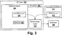 Ein „ID-Token” ist ein tragbares elektronisches Gerät, wie zum Beispiel ein USB-Stick, oder elf Dokument, insbesondere ein Wert- oder Sicherheitsdokument, das z. B. in Form einer Chipkarte ausgebildet ist. Ein ID-Token ist einem Nutzer zugeordnet und umfasst einen Prozessor und ein Speichermedium zur sichern Speicherung von Daten, z. B. von personenbezogenen Attributen oder privaten Schlüsseln.An "ID token" is a portable electronic device, such as a USB stick, or eleven document, especially a value or security document, e.g. B. is designed in the form of a chip card. An ID token is associated with a user and includes a processor and a storage medium for secure storage of data, e.g. From personal attributes or private keys.