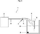 Dies kann auch durch einen Duschkopf mit zwei unterschiedlichen Austrittsbereichen gewährleistet werden, wobei ein erster, innerer Bereich des Duschkopfs für die NO-haltige Spüllösung vorgesehen ist und ein zweiter ringförmiger Austrittsbereich, der den inneren Bereich umschließt, für eine NO-freie, durch Ultraschall-angeregte Spüllösung vorgesehen ist. Dieser zweite Bereich bildet einen „Mantel“ aus NO-freier Spüllösung und sorgt dafür, dass das aus der Spüllösung des ersten mittleren Bereichs austretende NO hierein gelöst wird und nicht in die Umgebung gerät.This can also be ensured by a shower head with two different exit areas, wherein a first, inner area of the shower head is provided for the NO-containing rinse solution and a second annular exit area, which encloses the inner area, for a NO-free, by ultrasound excited rinsing solution is provided. This second area forms a "shell" of NO-free rinse solution and ensures that the NO exiting from the rinse solution of the first central area is released and does not enter the environment.