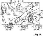 -  14 a perspective view of a field of view display device of the type set out here in an upper side of an instrument panel of a motor vehicle with three enlarged cutouts for explaining an adaptation of the generated 3D distance of a marking arrow which is displayed in a contact-analogous manner to a detected distance of the background object to be marked in each case.