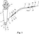 Über die Austrittsöffnung 14 und die Drahtführungsöffnung 20 gelangt der Führungsdraht 7 an eine Außenseite des Außenkatheters 18 und verläuft entlang derselben. Das proximale Ende des Führungsdrahtes 7 kann vom behandelnden Arzt ergriffen und an einer nicht näher dargestellten Führungsdrahtfixierung, die an der Steuereinheit 3 vorgesehen ist, befestigt werden. Wegen der geringen Länge des in der Vorrichtung 8 geführten Abschnitts des Führungsdrahtes 7 kann dessen Gesamtlänge erheblich reduziert werden.The