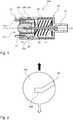 Die Steigung des Gewindegangs wird somit über diesen Abschnitt nicht fortgesetzt. Wenn die Dichtelementaufnahmeführungsstruktur in den orthogonalen Abschnitt bewegt wird, kann die Dichtelementaufnahme nicht durch Aufbringung reiner Zug- oder Druckkräfte in Richtung der Längsachse aus dieser Position bewegt werden. Entsprechend ermöglicht der orthogonale Abschnitt eine Sicherung der Positionierung der Dichtelementaufnahme in dieser Position, insbesondere in der Position mit minimalem Abstand zum Fluidanschluss, wenn der orthogonale Abschnitt zu dieser Position korrespondiert.The pitch of the thread is therefore not continued over this section. When the sealing element receiving guide structure is moved into the orthogonal section, the sealing element receiving cannot be moved from this position by applying pure tensile or compressive forces in the direction of the longitudinal axis. Correspondingly, the orthogonal section enables the positioning of the sealing element receptacle to be secured in this position, in particular in the position with a minimal distance from the fluid connection when the orthogonal section corresponds to this position.