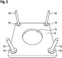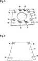 Im Randbereich der Grundplatte 9 sind um Ausnehmung 11 verteilt Gewindestangen 12 in entsprechende Gewindebohrungen der Grundplatte eingeschraubt. Die Distanzplatte 10 weist dazu kongruent ausgebildete Durchgangsbohrungen 13 auf. Zusammen mit in entsprechender Anzahl aufgelegten Unterlegscheiben 14 und den Flügelmuttern 15 bilden Gewindestangen 12, Grundplatte 9 und Distanzplatte 10 eine Spanneinrichtung für das flächige Substrat 17. Letzteres ist mit Ausstanzungen 16 versehen, die zu den Durchgangsbohrungen 13 kongruent sind. Dies erkennt man in