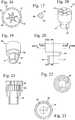 Die18 bis23 zeigen den Mitnehmer14 im Einzelnen. Der Mitnehmer14 besitzt einen Lagerabschnitt54, mit dem der Mitnehmer14 am Anlagerand25 drehbar gelagert ist. An der proximalen Seite des Lagerabschnitts54 besitzt der Mitnehmer14 einen Hülsenabschnitt57, an dessen Außenseite parallel zur Längsmittelachse50 verlaufende Sicherungsstege67 vorgesehen sind. Die Sicherungsstege67 dienen zur drehfesten Verbindung des Mitnehmers14 mit dem Dosierorgan18. Der Mitnehmer14 besitzt eine durchgehende Öffnung39, durch die der Stiftabschnitt48 des Bedienelements6 ragt, wie8 zeigt.The 18 to 23 show thedriver 14 in detail. Thedriver 14 owns astorage section 54 with which thedriver 14 at theinvestment edge 25 is rotatably mounted. At the proximal side of thebearing section 54 owns the driver 14 asleeve section 57 , on the outside thereof parallel to the longitudinalcentral axis 50 extendingsafety bars 67 are provided. The safety bars 67 serve for the non-rotatable connection of thedriver 14 with themetering device 18 , Thedriver 14 has acontinuous opening 39 through which thepin section 48 of theoperating element 6 sticks out, like 8th shows.