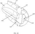 Zum Beispiel veranschaulichen18A-18C das sequenzielle Einsetzen oder Laden des Schneidwerkzeugs 22D in das Antriebsfutter 410, betrachtet von einer Stelle proximal dem Einsetzpunkt des Schneidwerkzeugs 22D, in das motorisierte Handstück 400. Im Zustand von18A wurde das Schneidwerkzeug 22D anfänglich in den Innendurchgang 414 eingesetzt und in Richtung der Antriebsstifte 420a, 420b geführt. Wie gezeigt, hat die zufällige Drehanordnung des Schneidwerkzeugs 22D in Bezug auf das Antriebsfutter 410 die erste und zweite Schnittstellenstruktur 306a, 306b zufällig so angeordnet, dass sie sich drehversetzt von den Antriebsstiften 420a, 420b befinden (z. B. ist die erste angetriebene Oberfläche 312a der ersten Schnittstellenstruktur 306a etwa senkrecht zur ersten Antriebsoberfläche 422a des ersten Antriebsstifts 420a). Somit muss das Schneidwerkzeug 22D gedreht werden (z. B. etwa 90 Grad), um die erste Schnittstellenstruktur 306a mit dem ersten Antriebsstift 420a und die zweite Schnittstellenstruktur 306b mit dem zweiten Antriebsstift 420b auszurichten.For example illustrate 18A-18C sequentially inserting orloading cutting tool 22D intopower chuck 410 as viewed from a location proximal to the point of insertion ofcutting tool 22D intomotorized handpiece 400. In the condition of FIG 18A For example, cuttingtool 22D was initially inserted intointerior passageway 414 and guided towarddrive pins 420a, 420b. As shown, the random rotational arrangement of cuttingtool 22D with respect to drivechuck 410 has randomly arranged first andsecond interface structures 306a, 306b to be rotationally offset fromdrive pins 420a, 420b (e.g., first drivensurface 312a of thefirst interface structure 306a approximately perpendicular to thefirst drive surface 422a of thefirst drive pin 420a). Thus, thecutting tool 22D must be rotated (e.g., approximately 90 degrees) to align thefirst interface structure 306a with thefirst drive pin 420a and thesecond interface structure 306b with thesecond drive pin 420b.
