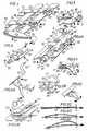 An den in Fig. 22 dargestellten durch Abstandhalter 220, 221 zusammengehaltenen Stütz- und Zugbändern 222, 223 greifen mit ihren Enden Scherenhebel 224, 225 an, die miteinander bei 226 gelenkig verbunden sind. An dem mit einer Lasche 227 am Stützband 222 festgelegten Scherenhebel 224 greift ein Bowdenzug 228 an, dessen Hülle 229 an dem anderen Scherenhebel 225 abgestützt ist. Durch Betätigung des Bowdenzuges 228 kann, wie aus der strichlierten Linie zu ersehen ist, die in dem Stützband 222 hervorgerufene Krümmung 230 in Fig. 22 nach rechts verlagert werden, weil die Scherenhebel 224, 225 auf einer Seite einander nähergebracht und auf der anderen Seite voneinander bewegt werden. Anstelle des Bowdenzuges kann natürlich auch eine Schraube, ein Exzenter od. dgl. an den betreffenden Hebelenden angreifen.The support and