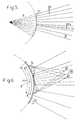 On peut incliner le faisceau acoustique par rapport à la normale à l'élément médian. La Figure 7 montre par exemple les lignes d'exploration terminales 47 du champ normal, ainsi que les limites d'exploration 48 avec une inclinaison +0 et 49 avec une inclinaison -0. La déflexion par voie électronique est obtenue de la même façon qu'avec un réseau plan phasé, souvent désigné par la formulation anglo-saxonne «phased array», à l'aide d'un choix de retards qui assurent la focalisation du faisceau, son inclinaison et la compensation de la courbure du réseau.The acoustic beam can be tilted with respect to the normal to the median element. Figure 7 shows for example the