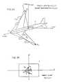 L'étape 70 consiste en la détermination des rotations qui permettent de passer du repère avion au repère observateur. Cette étape revient à déterminer les composantes des vecteurs unitaires du repère observateur dans le repère avion. Compte tenu de la symétrie miroir qui est possible par rapport à l'image, il existe deux solutions. Cependant, en certaines applications, on disposera à l'avance d'informations permettant de lever l'ambiguité entre ces deux solutions.Step 70 consists in determining the rotations which make it possible to move from the airplane reference frame to the observer reference frame. This step amounts to determining the components of the unit vectors of the observer frame in the plane frame. Given the mirror symmetry that is possible with respect to the image, there are two solutions. However, in certain applications, information will be available in advance to resolve the ambiguity between these two solutions.