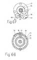 Figur 68 zeigt in einem tangentialen Anschnitt längs der Linie E - F der Fig.65 den Auslösemechanismus für die Wiederbelüftung und für die Dosisabgabe nach dem Rüttelvorgang. Die Federstahlzunge(27) hat das Keilstück der Keilprofilleiste(56) zum dargestellten Zeitpunkt überwunden. Letztere wurde durch die Druckfeder (64) zurückgeführt. Dabei verhindert die Schlitzführung(65) mit den Nutstiften ein seitliches Abgleiten unter Wirkung der Blattfeder(63), welche die Sperrzahnstange(62) in die Sperrzähne des kleinen Zahnrades- dessen Drehung bewirkend- eingreifen läßt. Das Mitdrehen des mit dem kleinen Zahnrad verbundenen großen Zahnrades(58) bewirkt,daß dessen Sägezähne den Schiebestift (59) dann in eine Nut der Auslösestange eingreifen lassen, wenn letztere(wie gezeigt) angehoben ist.FIG. 68 shows in a tangential cut along the line E - F of FIG. 65 the trigger mechanism for the re-ventilation and for the dose delivery after the shaking process. The spring steel tongue (27) has overcome the wedge piece of the wedge profile strip (56) at the time shown. The latter was returned by the compression spring (64). The slot guide (65) with the grooved pins prevents lateral sliding under the action of the leaf spring (63), which allows the locking rack (62) to engage in the locking teeth of the small gearwheel, causing it to rotate. The turning of the large gear (58) connected to the small gear causes its saw teeth to push the push pin (59) into a groove in the release rod intervene when the latter is raised (as shown).
