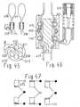 In Fig.47 sind zwei Flüssigkeitspumpen für die Betätigung einer Dosierpumpe als doppelt-wirkende Kolben-Zylinder-Pumpen in Verbindung mit Hubmagnet(413) und Rückstellfeder(414) dargestellt, wobei die beiden Zylinderenden über Schlauchverbindungen mit wenigstens einem Schlauchring(415) in Verbindung stehen. Der mittlere Schlauchring ist mit jedem der beiden sich gegenüberliegenden Zylinderenden durch Schlauch verbunden. Fig.47 verdeutlicht auch die Pumpenfunktion. In der Grundstellung A sind beide Kolben unter Federwirkung gesenkt. Der oberste Schlauchring ist von Flüssigkeit entlastet, während der untere und der mittlere Schlauchring durch Flüssigkeitsüberschuß aufgebläht sind. In Stellung B erhielt der oberste Magnet einen Impuls, wodurch der oberste Schlauchring aufgebläht und der mittlere entlastet ist. In Stellung C werden beide Magnete erregt, wodurch der untere Schlauchring entlastet und die beiden anderen aufgebläht werden. Die Impulsfolge --,+-,++ wirkt sich so aus, daß eine bestimmte Arzneiquantität von oben nach unten zur Kanüle hin verdrängt und im übrigen der Flüssigkeitsstrom gesperrt.47 shows two liquid pumps for actuating a metering pump as double-acting piston-cylinder pumps in conjunction with a lifting magnet (413) and return spring (414), the two cylinder ends being connected to at least one hose ring (415) via hose connections stand. The middle hose ring is connected to each of the two opposite cylinder ends by a hose. Fig. 47 also illustrates the pump function. In the basic position A, both pistons are lowered under spring action. The top hose ring is relieved of liquid, while the lower and the middle hose ring are inflated by excess liquid. In position B the top magnet received an impulse, which inflated the top hose ring and relieved the middle one. In position C, both magnets are excited, which relieves the pressure on the lower hose ring and inflates the other two. The pulse sequence -, + -, ++ has the effect that a certain quantity of medication goes from top to bottom The cannula is displaced and the liquid flow is blocked.