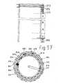 Die Figur 23 zeigt die von der Halbrinne ausgehenden Steuerarme und die von ihnen Deckelschieber mit Zähl-und Sperrvorrichtung in Teildarstellung im Längsschnitt und in der Darstellung in der Mitte im Querschnitt und unter diesem in einer Draufsicht. Rechts wird noch ein Vertikal-Schnitt gezeigt.FIG. 23 shows the control arms emanating from the half-channel and the cover slides with counting and locking device in partial representation in longitudinal section and in the representation in the middle in the transverse direction cut and under this in a top view. A vertical section is shown on the right.