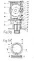 Figur 69 zeigt in vereinfachtem Querschnitt längs der Schnittlinie G - H der Fig.70 die drei Andruckpuffer (81), welche sowohl durch einen Federstahlbügel(82) zur Wand des Unterdruckspeichertöpfchens hin geführt als auch durch die Druckfeder(83) gegen dessen überstehenden Rand gepreßt wird. Zur Wiederentfernung des derart befestigten Töpfchens dient ein Schwenkhebel (84), welcher einen Keil zwischen Befestigungsplatte (4) und Deckelmembran(6) einzwängt. Letztere wird auf dem teilweisen Längsschnitt deutlicher, welcher unter dem Querschnitt gezeigt wird.FIG. 69 shows a simplified cross section along the section line G - H of FIG. 70, the three pressure buffers (81), which are guided both by a spring steel bracket (82) to the wall of the vacuum storage potty and are pressed by the compression spring (83) against its protruding edge becomes. A swivel lever (84), which clamps a wedge between the fastening plate (4) and the cover membrane (6), serves to remove the potty fastened in this way. The latter becomes clearer on the partial longitudinal section shown below the cross section.