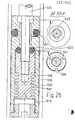 Figur 18 zeigt im Maßstab 2 : 1 rechts im Längsschnitt den Kanülenwechselmechanismus. Die Rasterkugel(432) wird vom Zentralstift(433) in seine Bohrung(434) innerhalb des Aufnahmekonus(435) für das Gehäuse(575) des Einschubteiles durch einen seitlichen Schlitz im Kanülenmagazin hindurch in die Mittelkerbe(436) des Kanülenkörpers gedrängt. Letztere kann über den Gasdruck, welcher hinter dem Kanülenmagazin für kurze Zeit aufgestaut ist, erst gesenkt werden, wenn der Zentralstift ganz gehoben ist. Dabei läßt dessen seitliche Abplattung(437) die Rasterkugel aus der Kanüle zurücktreten. Die Kanüle senkt sich bis zur gefederten S perrklinke (438) Wird der Zentralstift wieder gesenkt, so verdrängt er die Rasterkugel wieder, da sie in die obere Einkerbung der tieferen und in die untere Einkerbung der oberen Kanüle ausweichen kann. Wird durch den Schaltstift (356) im Deckel die Sperrklinke betätigt, so kann die Kanüle von der Lippendichtung in das Kanülenstaurohr übernommen werden. Da eine leichte Hebung des Zentralstiftes beim Deckelschluß wieder eine Lücke im Zentralstift die Rasterkugel passieren läßt, tritt die nachfolgende Kanüle tiefer. Das Kanälchen(439) im Kanülenkörper kommt in der Stellung desselben auf der Sperrklinke in Deckung mit der Arzneiaustrittsöffnung(440) aus der Stufenspritze. Die Darstellung rechts im Querschnitt zeigt die ovaläre Gestalt von Kanüle und Kanülenmagazin(262) und die Lippendichtung(441) oberhalb des beschriebenen Rastmechanismus für den Zentralstift(433).Figure 18 shows the cannula changing mechanism on the right in longitudinal section on a scale of 2: 1. The grid ball (432) is pushed by the central pin (433) into its bore (434) inside the receiving cone (435) for the housing (575) of the insert part through a side slot in the cannula magazine and into the central notch (436) of the cannula body. The latter can only be lowered via the gas pressure, which is dammed up behind the cannula magazine for a short time, when the central pin is fully raised. Its lateral flattening (437) allows the grid ball to withdraw from the cannula. The cannula descends to the spring-loaded locking pawl (438). If the central pin is lowered again, it displaces the grid ball again, since it can move into the upper notch of the lower one and into the lower notch of the upper cannula. If the pawl in the lid is actuated by the switch pin (356), the cannula can be transferred from the lip seal into the cannula backflow tube. Since a slight lifting of the central pin when the lid is closed again allows a gap in the central pin to pass through the grid ball, the following cannula goes deeper. The tubule (439) in the cannula body comes up in the same position the pawl is in register with the drug outlet opening (440) from the syringe. The illustration on the right in cross section shows the oval shape of the cannula and cannula magazine (262) and the lip seal (441) above the locking mechanism described for the central pin (433).