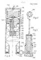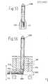 Figur 13 zeigt im Längschnitt eine Injektionsvorrichtung, welche mittels einer C02-Druckgaskapsel(256) über die Gasstrahlpumpe(257) den Unterdruck für die Saugglocke(173) erzeugt, welcher dort vom Rückschlagventil (323) aufrechterhalten wird. Die Entnahme des Druckgases erfolgt über den Dorn(258) mit Rinne, welcher mit dem Ventilblock(259) dicht verschraubt ist. Von der Deckelbrücke(260) aus schließen sich nach unten stehend an den Ventilblock zwei Koppelungsventile an, dann ein Steuerschacht mit Kanülenmagazin(262), je eine vordere und hintere Dosierspindel(263) mit Gewinde für die zugehörigen Dosiermuttern(264) -wie Fig.14 im Querschnitt zu sehen ist-, Schieberventil(265) und verschiebliches Pumpengehäuse(lll) für den auf einer Stange feststehenden Kolben der Dosiervorrichtung. Alle bisher genannten Bestandteile und noch andere gehören dem wieder zu benutzenden Geräteteil an, während im Gehäuse(226) des wegzuwerfenden Einschubteiles(269) die C02-Druckgaskapsel(256) über dem siebartig durchlöcherten Aufnahmerohr(269) für den Quellstift(270), den elastischen Beutel(271) mit einer Hilfsflüssigkeit und den Stufenspritzenzylinder(272) aus silikoniertem Glas enthält. Letzerer endet oben in dem Ventilrohr(273) über dem die Schiebemanschette(274) liegt. Der Trennkolben (275) zwischen Arznei-und Hilfsflüssigkeit weist den Wachsmantel(276) auf und endet in das seitlich abgehende und von unten in eine Bohrung des Kanülenmagazins(316) reichende hakenförmige Auslaßrohres(277). Einschubteil und Geräteteil sind mittels der Befestigungsspindel(279) mit einander verschraubt. Zum Anziehen der Gegenmutter (280) mit Vierkant dient der gefederte Ring(281) auf welchem der Rohrstutzen(282) mit dem Scharniergelenk (322) mittels Drehbewegung des Haltearmes(341) mit dem Scharniergelenk(322) für den Saugglockendeckel (342) einwirken kann. Zur Feststellung der Dosierpumpe dient der Winkelarm(283) mit Kraftübertragung zwischen der Arretierleiste(283) im Steuerschacht und dem über dem Zylinder des Pumpengehäuses(lll) gegen die Druckfeder(284) verschieblichen Schiebezylinder(285), welcher im Außenzylinder(286) geführt wird. In Einschnitten der Arrettierleiste ist um eine Längsachse schwenkbar der Keil(287) für den Dosiswechsel angeordnet und der Halteschlitz für die Zugschlaufe(288). Das nach der Lippendichtung(290) pfeifenartig erweiterte Kanülenstaurohr(289) wird mittels des Haltearmes beim Deckelschluß mit dem Ende der gebrauchten Kanüle in Kontakt gebracht. Oben ist noch die Druckfeder(291) für den Deckelschlitten(292) und die Aufnahmehülse(293) für den Beutel(256) mit der Hilfsflüssigkeit zu erkennen. Von den Gaskanälen sieht man den Querkanal(294) nach dem Schleußenventil -das in Figur 19 näher beschrieben ist-, welcher hinter der Sperrkugel des Rückschlagventiles(295) über den Kanal(296) durch die Kanüle(297) innerhalb einer Stopfenmembran in der Trägerhülse(293) in den Gasspeicherraum(429) des Einschubteiles führt. Über das parrallel zum Rückschlagventil(295) angeordnete Rückschlagventil(298), welches über eine Düse in die Schlauchverbindung(431) zum Ende des Kanülenmagazins die Druckgasleitung fortsetzt,führt der Kanal (299) zur Gasstrahlpumpe(257).FIG. 13 shows a longitudinal section of an injection device which, by means of a