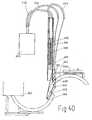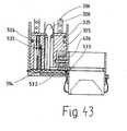 Die Figur 36 gibt eine schematische Draufsicht auf einen Sauginjektor als bevorzugte Ausgestaltung der Erfindung. Im Kanülenmagazin(262), welches als spiralig gewundener Schlauch ausgebildet ist, ist die Lagerung von Stapelkanülen zweier verschiedner Konstruktionen im Längsschnitt dargestellt.(Die genannten Kanülen, welche einen automatischen Kanülenwechsel erlauben, werden in den Fig.48,49 näher beschrieben). Die Dosierung ist für zwei Arzneien vorgesehen, programmiert und in Abhängigkeit von den Meßergebnissen korrigierbar. Es werden die Schnittebenen für die folgenden Figuren angegeben. Dargestellt sind der Zylinder(304) für die Aufnahme des Saugkolbens, der Einschubzylinder (334) mit den Dosiervorrichtungen und Arzneivorratsbehältern, das Scharniergelenk(322) für den Haltearm des Saugglockendeckels, das zentrale Halterohr(314) für das Kanülenmagazin, der Führungszylinder(313), das Rohr(319) für die Druckfeder mit dem den Saugkolben rückführenden Bowdenkabel, das Schutzröhrchen(320) für das spannende Ende für jene Druckfeder und das Leitrohr(321) für den starken Bowdenzug zur Spannung der Zugfeder des Saugkolbens. Die Banderole(400) entspricht einem Magazinende vor der Benutzung. Sie hält mittels des durch die Wandung des Schlauches gesteckten Stiftes(403) die Kanülen, welche unter der Wirkung der gespannten Druckfeder mit den Dichtungskörpern (370) an ihren Enden stehen im Magazin-zurück.FIG. 36 shows a schematic top view of a suction injector as a preferred embodiment of the invention. In the cannula magazine (262), which is designed as a spirally wound hose, the storage of stacking cannulas of two different constructions is shown in longitudinal section (the cannulas mentioned, which allow an automatic cannula change, are described in more detail in Fig. 48,49). The dosage is intended for two drugs, programmed and correctable depending on the measurement results. The cutting planes for the following figures are given. Shown are the cylinder (304) for receiving the suction piston, the insertion cylinder (334) with the dosing devices and medicine storage containers, the hinge joint (322) for the holding arm of the suction cup cover, the central holding tube (314) for the cannula magazine, the guide cylinder (313) , the tube (319) for the compression spring with the Bowden cable returning the suction piston, the protective tube (320) for the exciting end for that compression spring and the guide tube (321) for the strong Bowden cable for tensioning the tension spring of the suction piston. The banderole (400) corresponds to a magazine end before use. It holds the cannulas in the magazine by means of the pin (403) inserted through the wall of the tube, which are under the action of the tensioned compression spring with the sealing bodies (370) at their ends.
