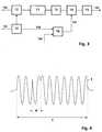Fig. 2 zeigt, wie ein an sich bekanntes Radarsystem zur Erzeugung von frequenzmodulierten Sendeimpulsen, modifiziert werden kann, um Sendeimpulse nach Fig. 1 zu erzeugen und damit die Möglichkeit einer Datenmodulation zu schaffen. Das von einer Expandereinrichtung 1 stammende Ausgangssignal 100 gelangt nach erfolgter Aufwärtsmischung im Mischer 2 zu einem Sendeverstärker 3. Der verstärkte Sendeimpuls wird über die Leitung 101 einem Zirkulator 4 zugeführt und durch eine kombinierte Sende- und Empfangsantenne 5 abgestrahlt. Die von der Antenne 5 empfangenen Echoimpulse werden über den Zirkulator 4 zu einer Empfangseinrichtung weitergeleitet, wo sie in bekannter Weise verarbeitet werden. Eine Stromversorgungseinrichtung 7 ist mit dem Sendeverstärker 3 sowie mit einer Steuereinrichtung 8 verbunden, die ihrerseits über die Leitung 102 an dem Sendeverstärker 3 angeschlossen ist. Über eine Leitung 103 werden der Expandereinrichtung 1 sowie der Steuereinrichtung 8 externe Triggersignale zugeführt. Diese Schaltung ansich, ist von Radargeräten, von denen frequenzmodulierte Sendeimpulse abgestrahlt werden, bekannt. Erfindungsgemäß ist eine Kodereinrichtung 9 über eine Leitung 104 mit der Expandereinrichtung 1 verbunden und an die Triggerleitung 103 angeschlossen. In der Kodereinrichtung 9 wird in Abhängigkeit von den eingangsseitig über eine Leitung 105 in irgend einer Form z. B. parallel anliegenden Daten die Position der Lücke bestimmt, (gemäß Fig. 1) worauf die Zeitlage der Lücke in Form eines Austastimpulses über die Leitung 104 der Expandereinrichtung 1 zugeführt wird. In der Expandereinrichtung 1 wird in Abhängigkeit von den Koderdaten die Lücke zeitlagenrichtig in den Radarsendeimpuls eingefügt. Der mit der Lücke versehene Sendeimpuls wird über die Leitung 100 in bekannter Weise weiterverarbeitet.FIG. 2 shows how a radar system known per se for generating frequency-modulated transmit pulses can be modified in order to generate transmit pulses according to FIG. 1 and thus to create the possibility of data modulation. The