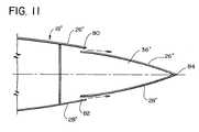 - A modified form of the slot means of the present invention is illustrated in Figure l1. There is shown the aft portion of a strut l8˝, where there are upper andlower slots 80 and 82 which are formed at the trailing edge portions of the upper and loweraerodynamic surfaces 26˝ and 28˝, respectively. Theseslots 80 and 82 are arranged so that the air discharged through theseslots 80 and 82 flows tangentially along thesurfaces 26˝ and 28˝ toward theend edge portion 84. Theair plenum 36˝ is formed in the trailing edge portion adjacent to theslots 80 and 82. The operation of this modified slot arrangement of Figure ll is substantially the The as in this previous embodiment. Sufficient pressurized air is blown through theseslots 80 and 82 so as to remove the discontinuity in the airflow which would otherwise be caused by the wake of the strut l8˝. It is evident that other specific slot configurations could be used without departing from the teachings of the present invention.