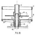Dans l'exemple représenté sur les figures 9 à 12, l'organe rotatif est constitué par le panier 10 d'une centrifugeuse. Ce panier tourne à l'intérieur d'une cuve (non représentée), dont seul apparaît sur la figure, le fond 2 présentant un orifice central 1, à l'intérieur duquel s'élève l'arbre moteur 3 entouré par une cheminée 4.In the example shown in Figures 9 to 12, the rotary member is constituted by the