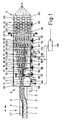 Spiegelbildlich zu dieser vorgenannten Mittellinie sind beidseitig von dem von den Transportbänder 9 - 13 gebildeten ersten Förderabschnitt am Zwischenförderer 2 weitere Förderabschnitte vorgesehen, und zwar bei der dargestellten Ausführungsform auf jeder Seite des von den Transportbändern 9 - 13 gebildeten ersten Förderabschnittes die folgenden weiteren, ebenfalls von Transportbändern gebildeten und bis an den Ausgang 14 reichenden Förderabschnitte: