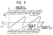 - An example of "wiggler" array is shown in Fig. 5. Several tens of magnet pairs which are magnetized in such a way that fluxes come into and go out of the magnets perpendicularly to the planesab which are defined by the longer sidea and the shorter sideb of the magnets which are arranged to present alternating N and S poles. Electron beams passing between two "wiggler" arrays are bent as they travel through the alternating magnetic field, with subsequent emission of radiation having a specified wavelength.