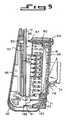 Fastener holder 52 also carriesalignment pin 80. In order to prevent the end ofalignment pin 80 from partly obstructing the open end ofcartridge 50 when the cartridge is open (which could present a possible hazard to the tissue being placed in, or removed from, the instrument), the pin is reciprocally mounted infastener holder 52 and provided with means for its automatic extension during the fastening operation and its automatic retraction whencartridge 50 is opened. The proximal end ofpin 80 is engaged by the slottedend 84 ofleaf spring 81 which extends along the proximal side offastener holder 52 and is anchored at the bottom offastener holder 52.Leaf spring 81 possesses anelongated slot 88 which is generally co-extensive with a slot formed infastener holder 52.Leaf spring 81 is so arranged that it will normally be inclined away from the proximal side offastener holder 52 in the direction towardpin 80. In this condition,spring 81 holdspin 80 in the retracted position so thatdistal end 86 ofpin 80 does not project fromfastener holder 52. As shown in Fig. 5,distal end 86 ofalignment pin 80 is advantageously provided with a point in order to enable the pin to easily piercetissue 12 as the pin is extended beyondfastener ejecting surface 55 during the fastening operation.