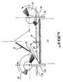 En se reportant notamment à la figure 3, on constate que chaque ensemble 13 comporte essentiellement au niveau de chaque coin du plan de pose un organe rotatif 35 formé par une brosse et avantageusement en forme d'un segment de cercle d'un angle avantageusement supérieur à 180° de façon qu'un volet qui vient d'être déposé soit pendant un court délai de temps appuyé au niveau de chaque pli par les organes 35. Ceux-ci sont en forme de brosse. Chacune de ces brosses 35 est entraînée en rotation autour d'un axe s'étendant parallèlement au plan de pose et aux plis des volets se trouvant sur le support 1, à une distance et un endroit au-dessus du plan de pose des volets avantageusement légèrement décalés vers l'extérieur. Grâce à cette disposition des brosses 35, elles constituent des moyens d'aplatissement et d'écrasement des plis.Referring in particular to FIG. 3, it can be seen that each