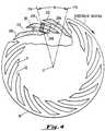 TRANSMISSIVE CODE WHEEL- With particular reference to FIG. 4, the preferred orientation ofphoto detector array 29 is illustrated for an embodiment in which the light modulating means comprisescode wheel 10 disposed between a light source and thephoto detector array 29. In FIG. 4, the light source is not shown and a section ofcode wheel 10 has been cut away to reveal the relationship between the spiral shaped images 200-204 andphoto detector array 29. According to embodiments of the type shown in FIG. 4, thecode wheel 10 is preferably constructed of an optically opaque material, such as stainless steel, andwindows 11 are transmissive to the light beams produced by the light source whilespokes 12 are non-transmissive. Thephoto detector array 29 is preferably held in a plane which is substantially parallel to the plane ofcode wheel 10.