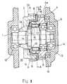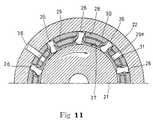 - In Fig.8, 21 is a rotation shaft having various stepped portions on the outer peripheral surface. 24 is an output gear which is connected to one of the stepped portions of therotation shaft 21 through a spline 24a. 24b is a tooth formed on the outer periphery of theoutput gear 24, which is engaged with a gear of a driven shaft (not shown). 37 is an outer peripheral cylindrical surface, which is formed on another stepped portion of the outer periphery of therotation shaft 21. 22 is an input gear having an inner peripheralcylindrical surface 38, which is disposed with clearance to the outer periphery of the outer peripheralcylindrical surface 37. 22a is a tooth formed on the outer periphery of theinput gear 22, which is engaged with a gear of a driving shaft (not shown).