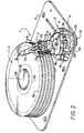 - A plastic material suitable for this molding operation, again, is polycarbonate which may be glass or carbon filled. As seen in Fig. 2, and in the plan views of Figs. 3, 4 and 5, and in the enlarged views of Fig. 6 and 7, the cantilever crash stoparms 11b are non-uniformly tapered between their wide bases and their narrower upper ends and are of lesser thickness than of width. The purpose of this is to provide adequate stiffness in the direction of forces resulting from impact of thepin 9d with a confronting edge of acrash stop arm 11b and to provide flexibility in a direction different from the direction of the impact force, so that the outer radial limitcrash stop member 11b, on the left as seen in Fig. 2, for example, may be displaced away from the end of thepin 9d, to permit the outer end of thepin 9d to move therepast whenever thetransducers 7e are being loaded or unloaded with respect to or on thedisk 5a.