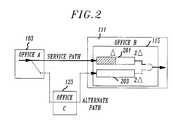 FIG. 2 shows an alternate high level view of the network shown in FIG.1. This alternate view focuses on the delays that are required to be preprovisioned inthe errorless switch node, office (B) 111. Because of the nature of modern highspeed communication systems and the large differential delay that can arise if adiverse route is used for the alternate channel, it is typically necessary topreprovision a delay on the service channel. The delay employed on theservicechannel 201 is set equal to the maximum differential delay between the servicechannel and the alternate channel, Δ. As in prior systems, the delay of the servicechannel combined with the preprovisioned delay is always greater than the delayinherent in the alternate channel. It is imperative that the delay be preprovisioned iflarge differences in path delay between the service channel and the alternate channelare to be accommodated. This is because a large change of delay on the servicechannel could cause either the signal transported by the service channel to degrade orlose data. Implementations of the service channel, however, typically allow additionof up to twice the maximum differential delay, Δ, although only one times themaximum differential delay is actually provisioned. The ability to add extra delay isprovided so that any channel be used as either as a service channel or as an alternatechannel. Additionally, avariable delay 203, the duration of which ranges from zeroto two times the maximum differential delay, i.e., 2Δ, can be controllably added tothe alternate channel. As a result, a delay can always be added to the alternate channel so that the total delay of the alternate channel is equal to the total delay ofthe service channel. Therefore, although the delay of the alternate channel withoutbuild-out delay can be shorter or longer than the delay of any given service channelwithout build-out delay, the total delay of the channels can be equalized by use oftheir respective build-out delays.