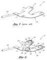 - In a second embodiment illustrated in Figure 5, abacking strip 46 may be U-shaped or horseshoe shaped to generally conform to the shape of thebite fork 10. Thealternate backing strip 46 is the same in thickness and composition as the preferred embodiment of thebacking strip 36 and varies only in shape. Also, thestrip 46 has the same type ofadhesive 34 andprotective sheet 38 attached. This embodiment is particularly advantageous because thestrip 46 covers most of the surface of thebite fork 10 thereby separating or insulating thebite fork 10 from the patient's saliva. Protecting thebite fork 10 from saliva makes this form desirable for sanitary purposes. As illustrated in Figure 5, thebacking strip 46 has three small mounds ofdental impression material 32 mounted on itstop side 48. The mounds ofdental impression material 32 are spaced along thebacking strip 46 so that they will have positions on thebite fork 10 similar to the positions of thedental impression pads 30 in Figure 2. As a further alternative, acontinuous layer 50 of thedental impression material 32 in the U-shape of thebite fork 10, as shown in Figure 5A, can be positioned on thebacking strip 46 instead of the three mounds ofdental impression material 32. When thebacking strip 46 is utilized, only twostrips 46 are needed to position a total of six pieces ofdental impression material 32 or twocontinuous layers 50 on thebite fork 10. Twostrips 46 could also be formed as one H-shape which would be wrapped onto the tray with the upper half of the strip being placed on one side of the tray and the other half being applied to the other side.