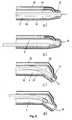 Figur 4 zeigt eine Schnittdarstellung eines zweiten Ausführungsbeispiels des zum Patienten proximalen Endes eines erfindungsgemäßen Instruments, und zwar gerade mit herausgeschobener Nadelelektrode in Figur 4a und gerade mit hineingezogener Nadelelektrode in Figur 4b sowie gebogen mit herausgeschobener Nadelelektrode in Figur 4c und gebogen mit hineingezogener Nadelelektrodein Figur 4d.FIG. 4 shows a sectional illustration of a second exemplary embodiment of the end of an instrument according to the invention proximal to the patient, specifically with the needle electrode pushed out in FIG. 4a and straight with the needle electrode drawn in FIG. 4b and bent with the needle electrode pushed out in FIG. 4c and bent with the needle electrode pulled in FIG. 4d.