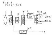 Description of Related Art- Fig.1 shows an arrangement of color filters of an imagesensor described, for example, on pages 76 through 82 of"National Technical Report", Vol. 31, No.1, Feb. 1985,composed by Matsushita Techno Research Co., Ltd. and publishedby Ohmsha Publishing Co., Ltd. In Fig.1, Mg representsa pixel having a magenta color filter, G represents apixel having a green color filter, Cy represents a pixelhaving a cyan color filter and Ye represents a pixel havinga yellow color filter. Fig.2 shows a part of a signal processingcircuit of a color video camera which employs animage sensor consisting of these color filters arrangedthereon. In Fig.2,numeral 1 indicates a lens,numeral 2indicates an image sensor,numeral 3 indicates a band-passfilter (BPF),numeral 4 indicates a detector,numeral 5indicates a one horizontal period delay circuit (1HDLY),numeral 6 indicates a switching circuit andnumeral 45indicates a low-pass filter (LPF).