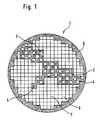 In Figur 1 erkennbar sind schematisiert dargestellt Zonen2,3,4 und5, welche Zonen von Kanälen 6 repräsentieren sollen, die in vorgebbaren Toleranzen der Sollgeometrie eines idealisierten Wabenkörper-Monolithen entsprechen. Die besagten Zonen sind im dargestellten Ausführungsbeispiel quadratisch ausgebildet. Die hellbelassenen Felder innerhalb der Zonen weisen auf diejenigen Kanäle hin, die bei der Durchführung des Verfahrens offengelassen werden, wohingegen die geschwärzten Stellen auf denjenigen Kanälen 6 liegen, welche zu verschließen sind. Die geschwärzten Stellen sind dann ebenfalls die Positionen, an denen ein zugeordneter Dosierkopf die Düsen aufweist, mittels derer die Stöpselmasse in die betreffenden Kanäle eingespritzt wird. So übergreift die Zone2 insgesamt 16 Kanäle von denen 8 verschlossen werden sollen. Das entsprechende Verhältnis in der Zone3 beträgt 9:4, bei der Zone4 4:2. Die Zone5 repräsentiert lediglich einen einzelnen Kanal 6. In diesem Falle muß der betreffende Kanal durch einen Dosierkopf mit nur einer Düse verschlossen werden, da die geometrischen Abweichungen so groß sind, daß kein anderer Dosierkopf mit mehreren Düsen verwendet werden kann.