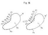 - Figs. 18 illustrates how to make an adjustment when thepresent workpiece W (original) is replaced by another modifiedworkpiece W'' which differs slightly only in the shape of worktarget portion from the original workpiece W. Specifically, theoriginal workpiece has a work target portion formed by points P1,P2, P3, P4, P5, P6, P7, --- Pn, whereas the modified workpiece W''has a work target portion formed by points P1, P2, P3", P4'', P5'',P6'', P7, --- Pn. The modified workpiece W'' is otherwise the sameas the original workpiece W.