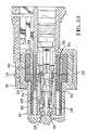 Theouter spring member 14, which has been stampedand formed from a single piece of sheet metal stock, is ofrectangular cross section corresponding to that of saidbox portions. Theouter spring member 14 encloses theboxportions 16, 18, 20 and 23 of theinner spring member 12.Theouter spring member 14 has a first pair ofoppositeside walls 40 and a second pair of opposite side walls 42(only one of which is shown) which are adjacent to theside wall 40. A resilient, rearwardly directed latchingtongue 44 stamped out from each of theside walls 40,extends obliquely away therefrom. At the forward end ofthespring member 14,arcuate extensions 46 of thesidewalls 40 overlie thebights 48 of theinner spring member12, to limit forward movement of thereceptacle boxportion 16. Theouter spring member 14 is fixed to theinner spring member 12 by means of tabs 49 (only one ofwhich is shown, in Figure 1), sheared from the rearwardend portions of theside walls 42 and which have beenclinched into respective slots 50 (Figure 5) in theboxportion 23 of thespring member 12. Thespring member 12is thus secured in theouter spring member 14 such thatthebox portions 16, 18 and 20 can move within thespringmember 14 in the direction of the axis X-X.
