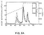 - Figures 6A-6C illustrates size exclusion HPLC (Figure 6A) and bothnon-reduced (Figure 6B) and reduced (Figure 6C) SDS-PAGE analysis of thepreparative purification of M-CSF, more particularly, Figure 6A graphicallyillustrates the separation on Phenyl-HPLC size exclusion chromatography of the threespecies of M-CSF dimers of Figures 5A-5C, i.e., the 158 homodimer, the 221Fhomodimer and the 158/221 heterodimer, and indicates that the three absorbancepeaks at 280 nm (solid line) correlate with M-CSF activity in U/ml x 10-6 (dottedline); Figure 6B illustrates an SDS-PAGE analysis under non-reducing conditions ofpreparative purification of the 158/221F heterodimer (intermediate molecular weightspecies) relative to the 158 homodimer (lower molecular weight species) and the 221Fhomodimer (highest molecular weight species); Figure 6C illustrates an SDS-PAGEanalysis under reducing conditions of the preparative purification of the 158/221Fheterodimer (middle lanes) relative to the 158 homodimer (left lanes) and the 221Fhomodimer (right lanes); and