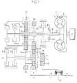 The firstplanetary gear 24 of the firstplanetarygear unit 10 transfers the torque through the firstplanetary carrier 26 to afirst transfer gear 28, whichis engaged with thesecond ring gear 30 of the secondplanetary gear unit 14. The secondplanetary gear 32engaged between thesecond sun gear 20 and thesecondring gear 30 is connected via the secondplanetarycarrier 34 to asecond transfer gear 36 engaged with thefirst ring gear 18. Thesecond ring gear 30 transfersthe torque through a drum and a finalreduction drivegear 38 to a final driven gear connected with the differential gear D.