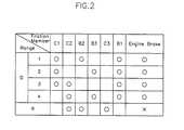 Among the friction elements, a first frictionelement C1 is to selectively connect the torque of theturbine 6 to thefirst sun gear 16 of the firstplanetary gear unit 10 in the first, second and thirdforward speeds, a second friction element B1 to work inall the forward speeds, and a third friction element B2to make thefirst ring gear 18 of the firstplanetarygear unit 10 serve as a reaction element in the firstforward speed. A fourth friction element B3 is providedto selectively lock thesecond sun gear 20 of the secondplanetary gear unit 14 to serve as a reaction element when cooperating with the first and second frictionelements C1 and B1. A fifth friction element C2 isprovided to make thefirst ring gear 18 of the firstplanetary gear unit 10 serve as an input element, and asixth friction element C3 to connect thestator 22 ofthetorque converter 2 with thefirst sun gear 16 of thefirstplanetary gear unit 10 to make thefirst sun gear16 serve as an input element. Additionally, a one-wayclutch 23 is provided between thestator 22 and thesixth friction element C3 to transfer to the first sungear 16 a reverse rotational force of the directionopposite to that of the engine, which transfer isachieved with locking theturbine 6 of thetorqueconverter 2 that is accomplished by working the thirdand fifth friction elements B2 and C2 to lock thefirstring gear 18.