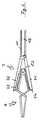 Gemäß der DE-A-30 44 186 wird ein Klammerhaltegerät zumAbklemmen von Blutgefäßen offenbart, wobei ein Arbeits-elementals eine Klammer mit Alpha-Form ausgebildet ist,die in einem "V" endet. Dabei besteht die Klammer aushinteren Schenkeln, die von einer abgerundeten Spitzeunter elastischer Spannung auseinanderlaufen, sich dannkreuzen und in im wesentlichen geraden Schenkeln enden,die den Greifabschnitt der Klammer bilden.According to DE-A-30 44 186 a clip holding device forDisclosure of blood vessels revealed being a working elementis designed as an alpha-shaped bracket,which ends in a "V". The bracket consists ofrear thighs by a rounded tipdiverge under elastic tension, thencross and end in essentially straight legs,which form the gripping section of the clip.